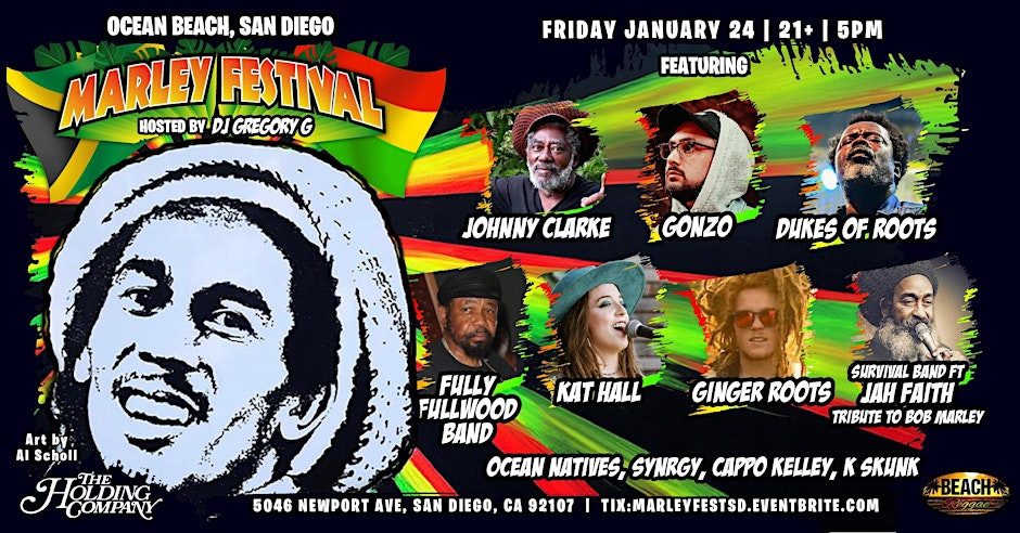 Come out to Marley Fest San Diego January 24th ft Johnny Clarke, Fully Fulwood Band, GONZO, Dukes of Roots, Kat Hall, Ginger Roots, Jah Faith & Survival Band Tribute to Bob Marley and Ocean Natives performing with friends Synrgy, Cappo Kelly and K Skunk at the Holding Company in Ocean Beach-San Diego. The event is hosted by DJ Gregory G. Get there early for happy hour from 5pm to 6pm. Poster art by Al Scholl. We are supporting your recovery!!! The event is 21+. Limited amount of VIP tables available. No refunds or exchanges.