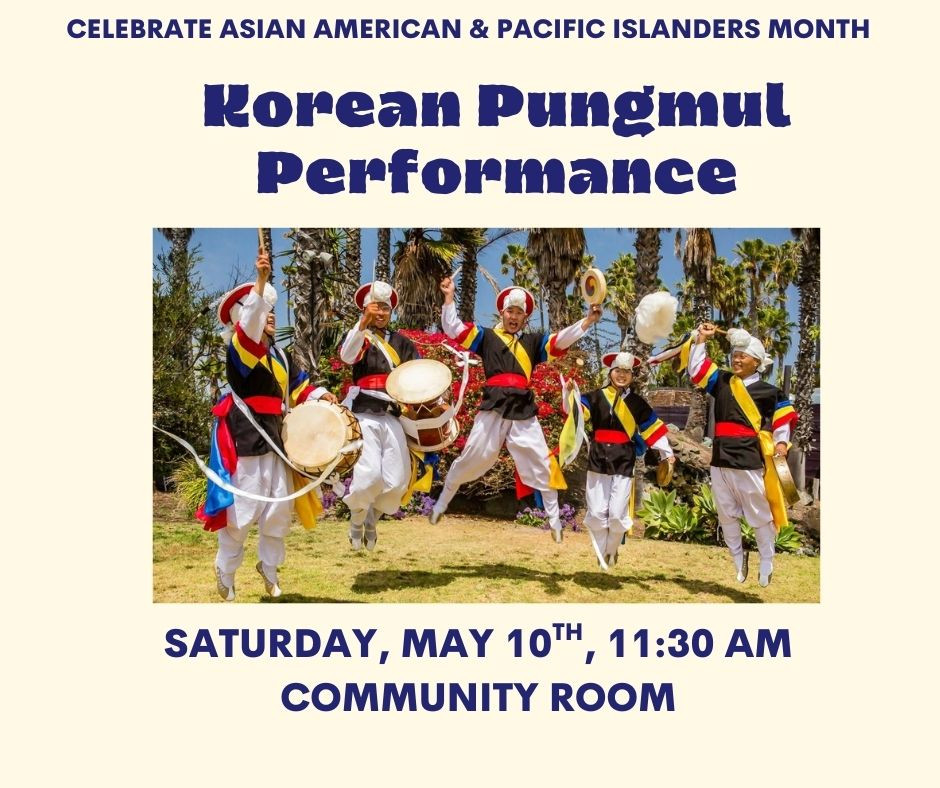 Celebrate Asian American and Pacific Islanders Month in May with a Korean Pungmul performance and craft on Saturday, May 10th at 11:30am! Pungmul (풍물) is a Korean tradition of folk percussion that includes drumming, dancing, and singing.
