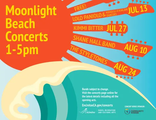 Toes in the sand--what better way to enjoy a summer concert? Moonlight Beach is the place to be all summer, and twice a month in July and August, the City's Cultural Arts Division brings great performers to the stage. Musical styles vary and may include everything from Latin jazz and country western to reggae and '80s rock. Bands play on a state of the art professional stage in front of a large sandy beach, with plenty of room to move with the music. Sponsorship opportunities are available.